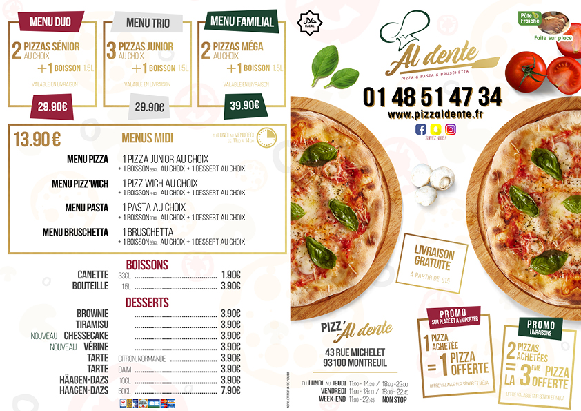 A textbook case. In a context of expansion, a Pizzaiolo wants to rebrand his business image by redesigning his website, his logo, his menus and his facade. For the digital part, he worked with a website creation company, VitriWeb, that designed a basic frame ; and I was hired for the graphic part.